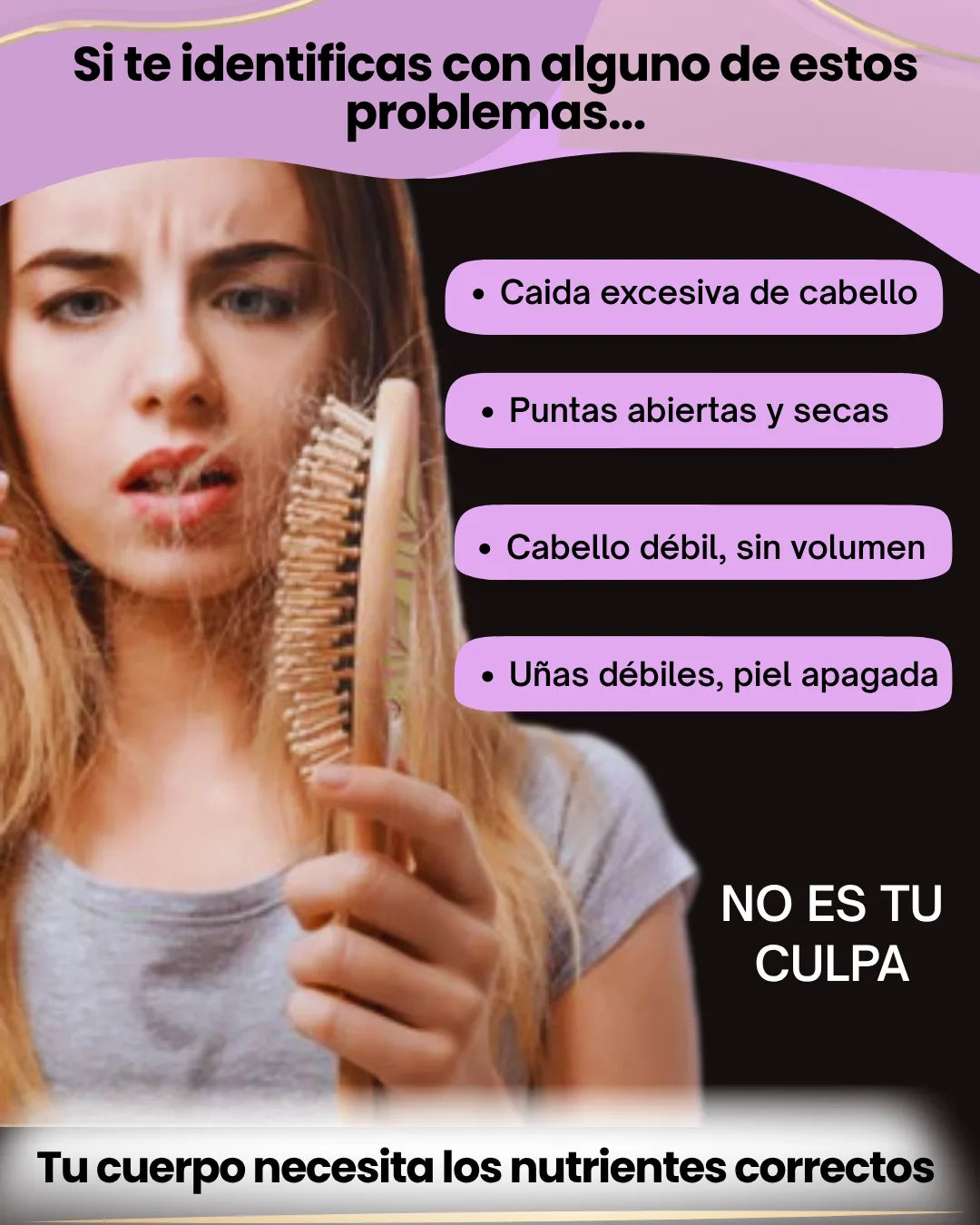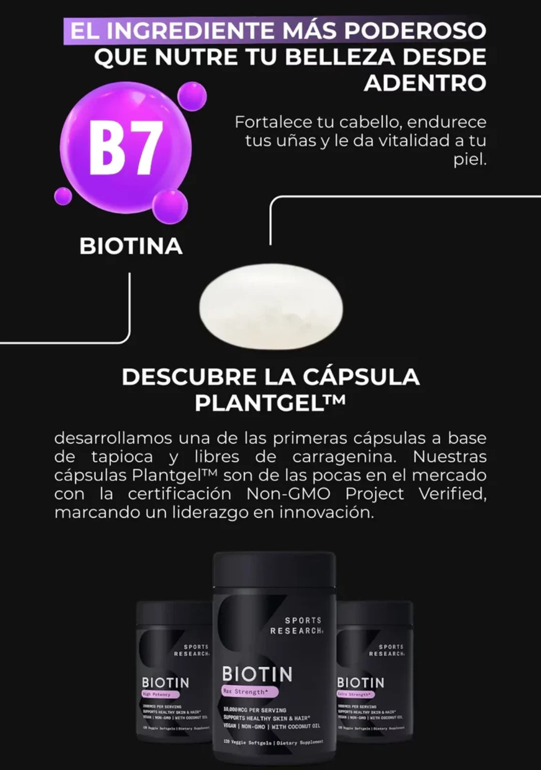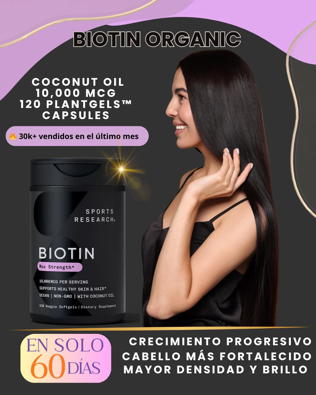 Nuestra fórmula contiene 10.000 mcg reales de biotina pura + aceite de coco orgánico, lo que garantiza mayor absorción y eficacia. Además, viene en cápsulas vegetales, sin químicos ni gelatina.