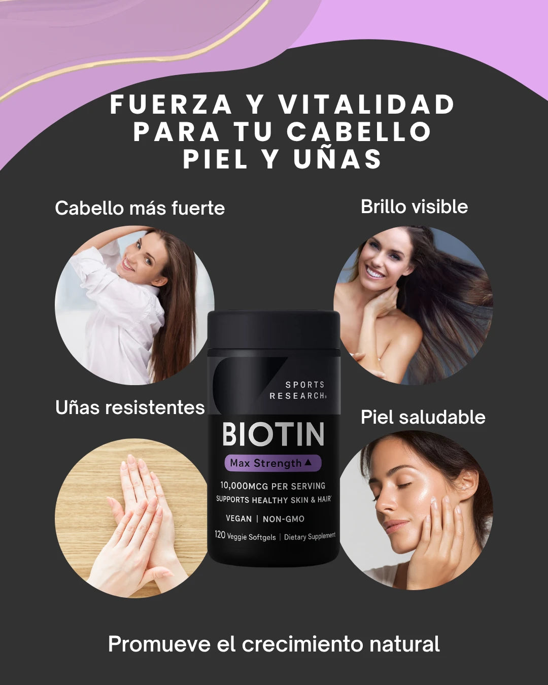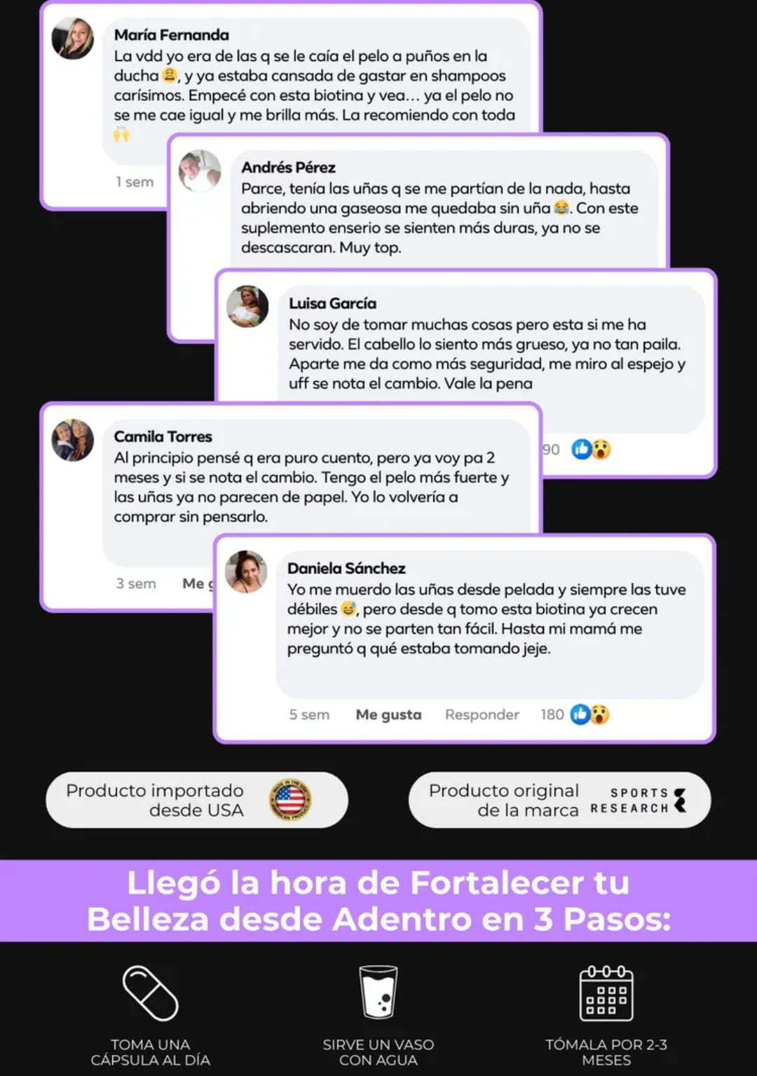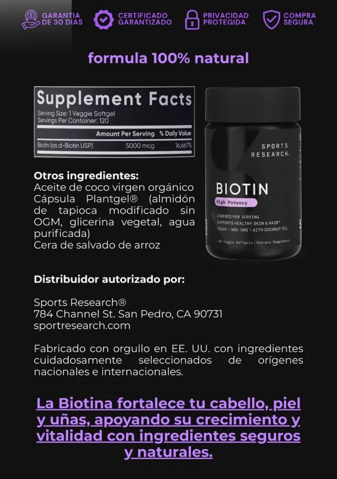 Nuestra fórmula contiene 10.000 mcg reales de biotina pura + aceite de coco orgánico, lo que garantiza mayor absorción y eficacia. Además, viene en cápsulas vegetales, sin químicos ni gelatina.