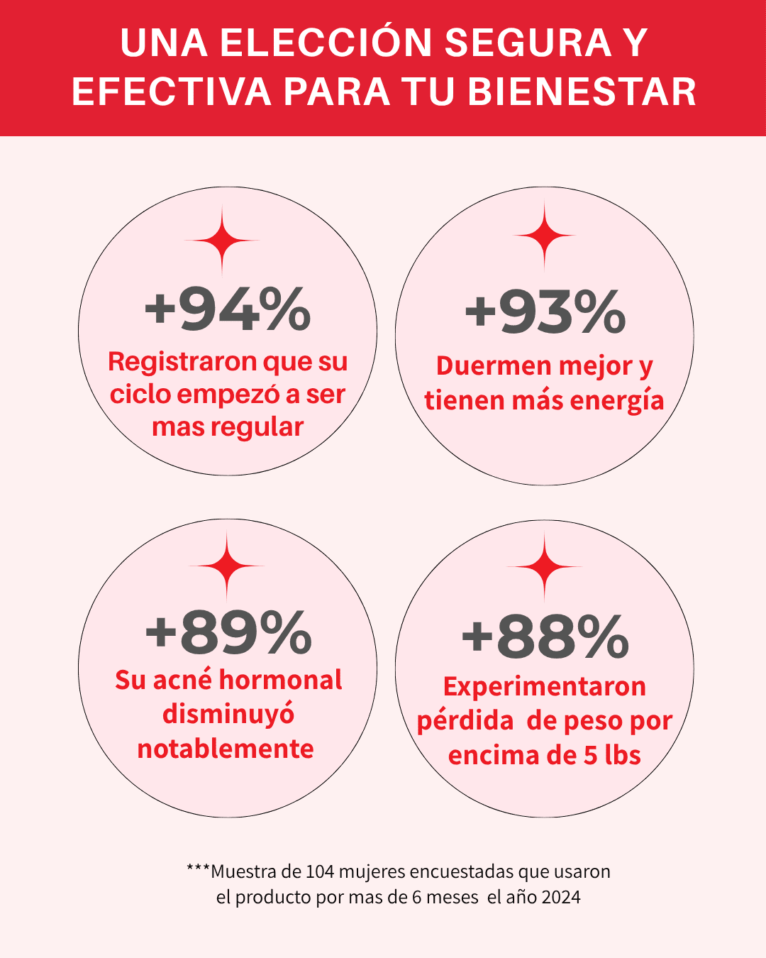 Difiere según la persona. Si bien algunos efectos pueden notarse en días o semanas, como la mejora del acné hormonal y los ciclos regulares, puede llevar varios meses abordar por completo las deficiencias importantes, como la pérdida de peso. La mayoría de los usuarios ven la mayor parte de los resultados en el mes 3.